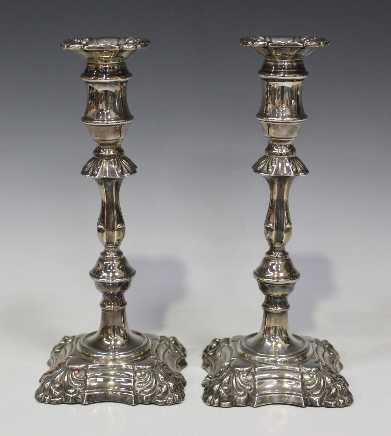 A pair of Elizabeth II silver candlesticks, each urn shaped sconce with detachable nozzle above a baluster stem and stepped square base, cornered by stylized scallop shells, Birmingham 1966 by Hampton Utilities, height 24.5cm.