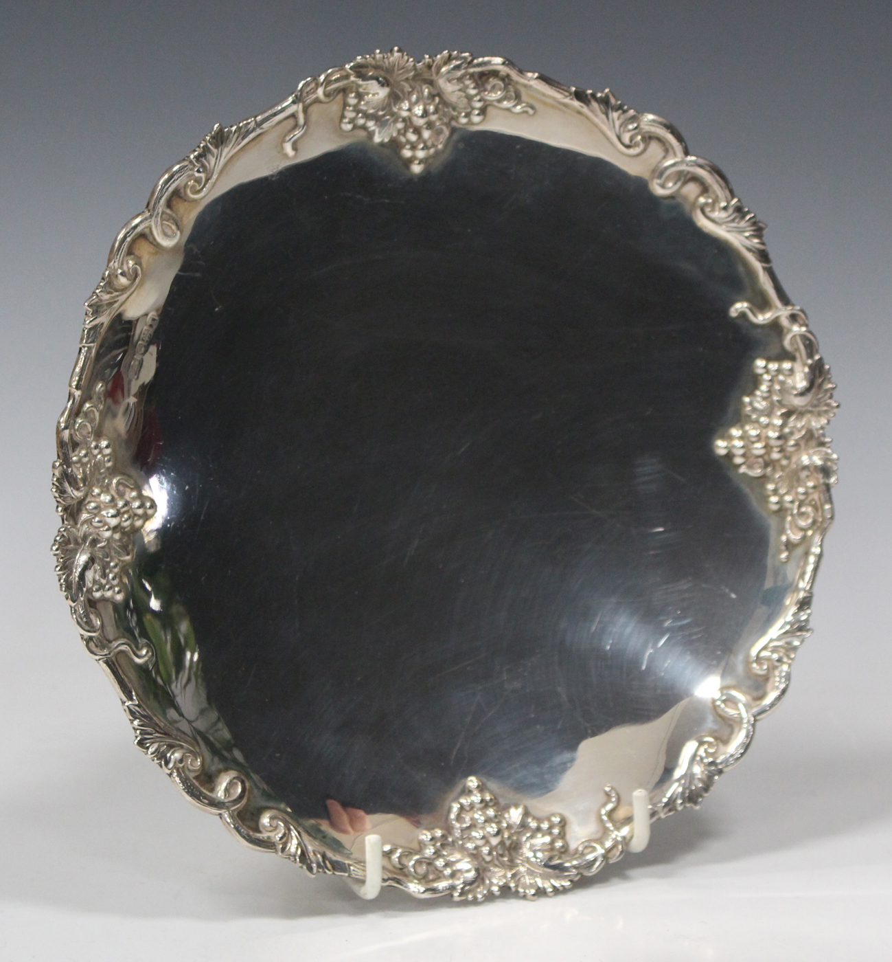 A George VI silver circular tazza with a cast fruiting vine rim, raised on a similarly decorated circular foot, Sheffield 1940 by Mappin & Webb, diameter 22.5cm.