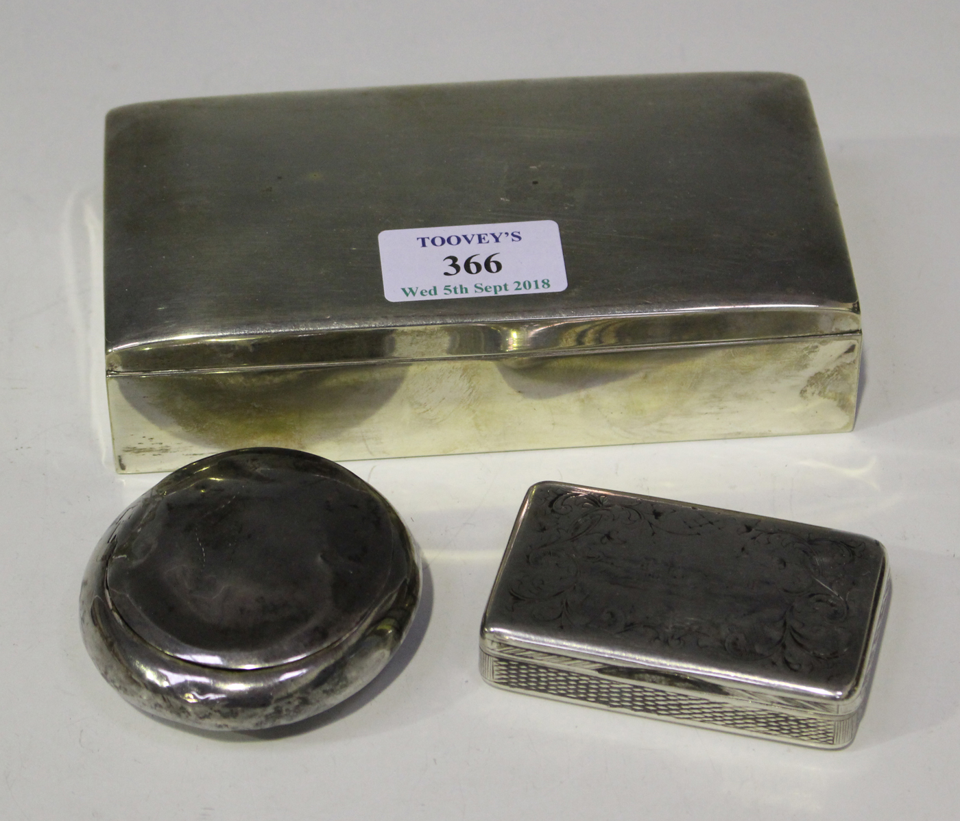 A sterling rectangular cigarette box, length 16cm, together with a Russian silver and niello snuff box (worn) and a Victorian silver tobacco box.