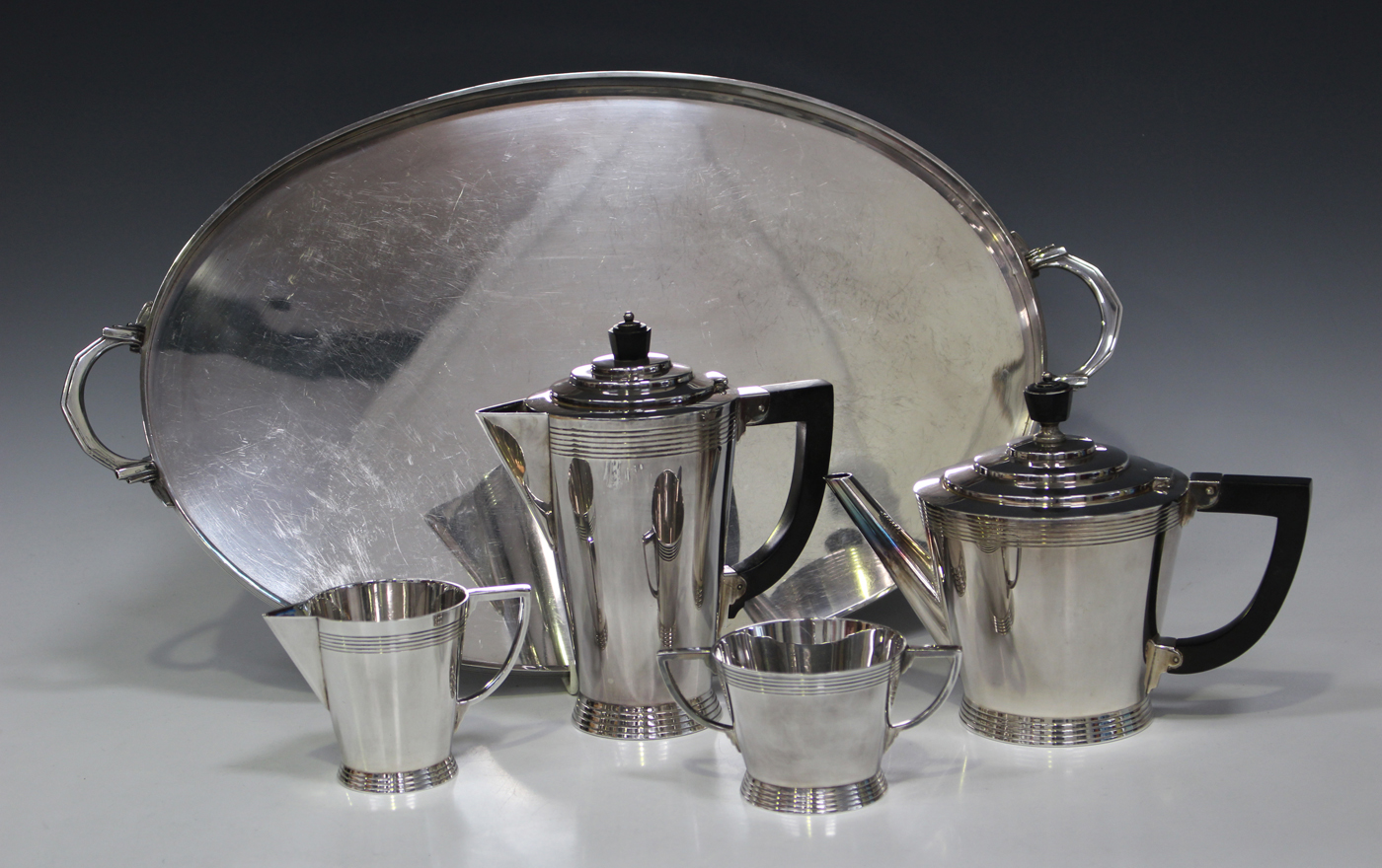 A Mappin & Webb Art Deco style five piece tea set of tapering cylindrical form with banded and stepped decoration, comprising oval two handled tray, teapot, hot water pot, sugar bowl and milk jug.