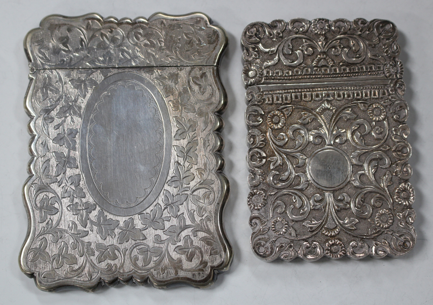 A plated rectangular card case, engraved with scrolling foliate stems, height 9.8cm, together with an Eastern white metal card case, decorated in relief with flowers and scrolls, height 8.5cm.