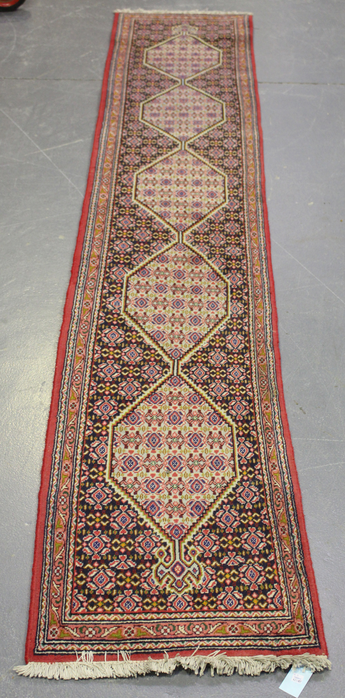 A Senneh runner, North-west Persia, late 20th century, the charcoal field with five linked lozenge medallions, within a pink trailing vine border, 192cm x 53cm.