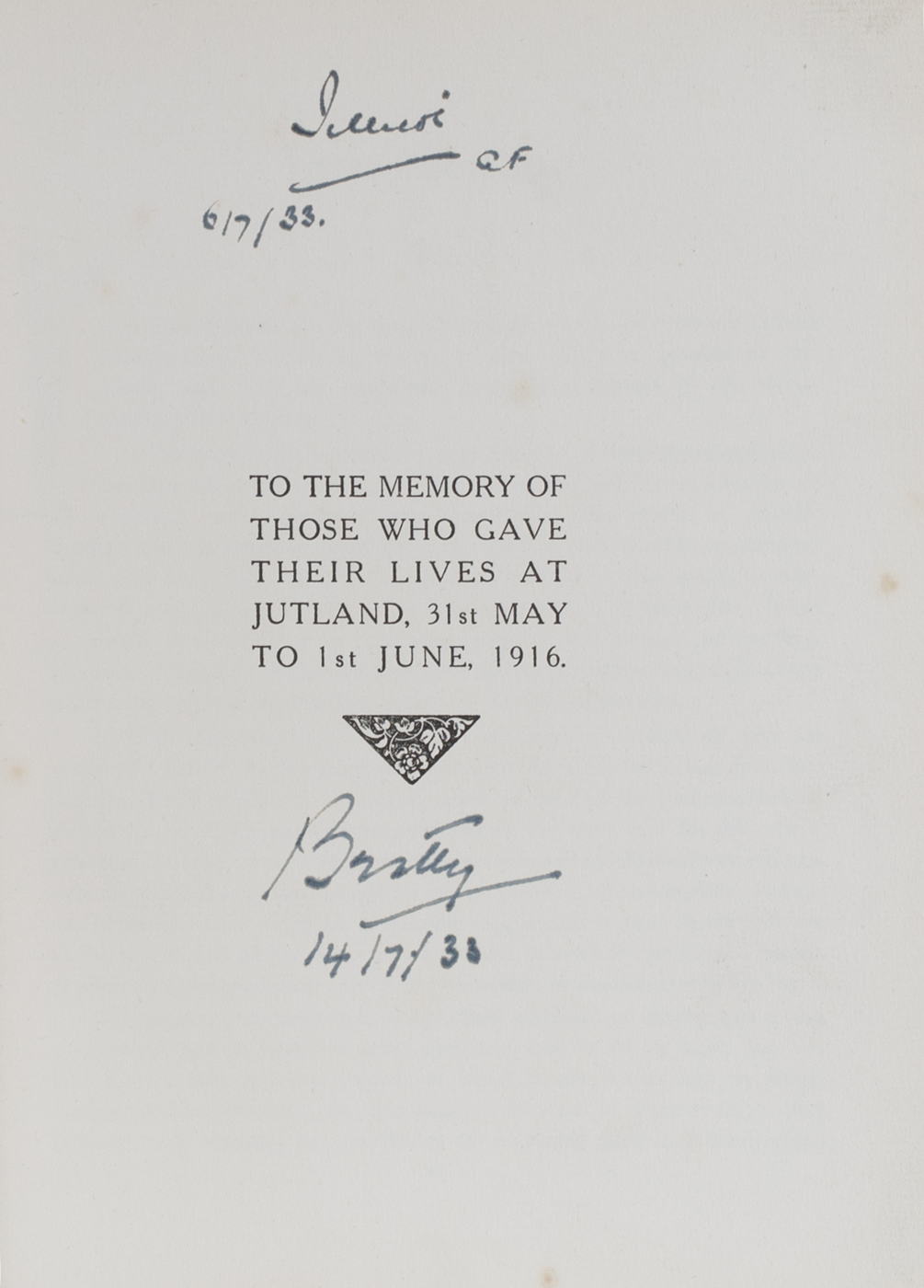 FIRST WORLD WAR. - H.W. FAWCETT and G.W. HOOPER (editors). The Fighting at Jutland…. The Personal Experiences of Sixty Officers and Men of the British Fleet. Glasgow: Maclure, Macdonald & Co., [n.d. but circa 1920]. Signed by Admiral Lord Jellicoe and Admiral Lord Beatty in ink on the dedication page, 4to (251 x 190mm.) 10 tipped-in photogravure plates, 35 photographic plates, numerous maps and illustrations. (Browning to margins, occasional spotting, both inner joints cracked.) Contemporary morocco-backed blue cloth with buckram onlay to upper cover, t.e.g. (rubbing to extremities, spotting to front endpaper, both inner joints cracked). Note: Admiral of the Fleet John Jellicoe commanded the Grand Fleet at the Battle of Jutland in May 1916. Admiral of the Fleet David Beatty commanded the 1st Battlecruiser Squadron at Jutland and later he succeeded Admiral Jellicoe as the Commander-in-Chief of the Grand Fleet. Provenance: G.G. Borrett (ink signature to the half-title).