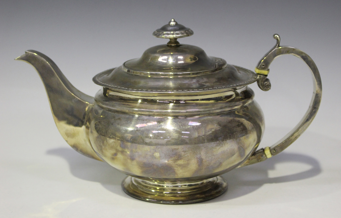 A George III Scottish silver circular teapot with gadrooned rim and loop handle, on a circular foot, Edinburgh 1818 by Luke F. Newlands, height 16cm.