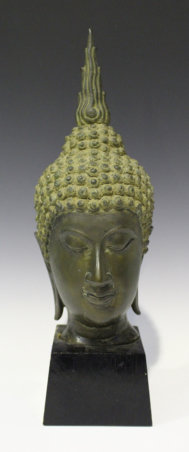A Thai bronze Buddha head, probably 19th century, modelled with tightly curled hair rising to a domed unisa and flame surmount, height 36.5cm, with ebonized plinth.