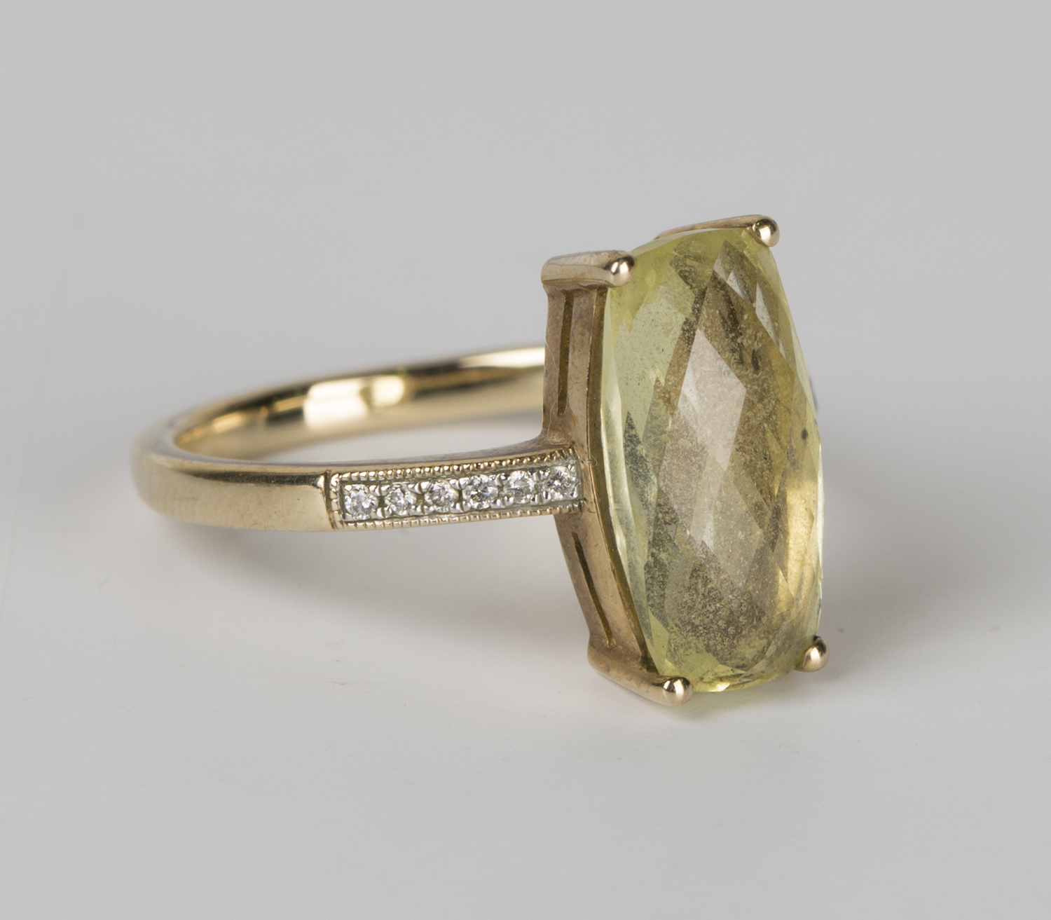 A 9ct gold, citrine and diamond ring, mounted with the faceted citrine between circular cut diamond set six stone shoulders, ring size approx N1/2.