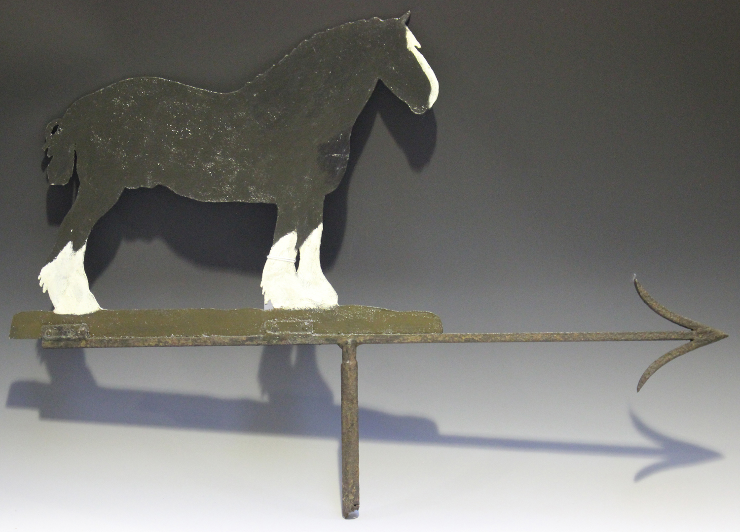 A 19th century tin plate and wrought iron weather vane, fret cut in the form of a shire horse above an arrow, length 80cm (later painted).