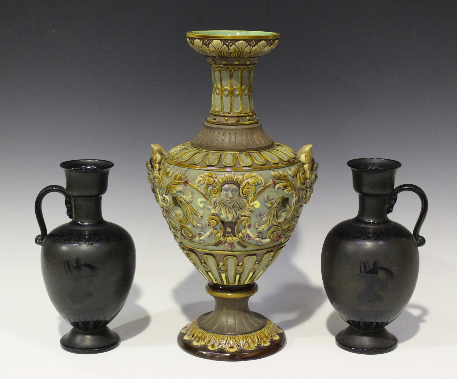 A pair of Davenport Beck & Co black ground pottery jugs, circa 1873-80, each decorated with classical figures within geometric borders, printed mark to base of one, height 21cm, together with a Wilhelm Schiller & Sohn pottery vase, late 19th century, moulded with grotesques and scrolls, applied and impressed marks to base, height 36cm.
