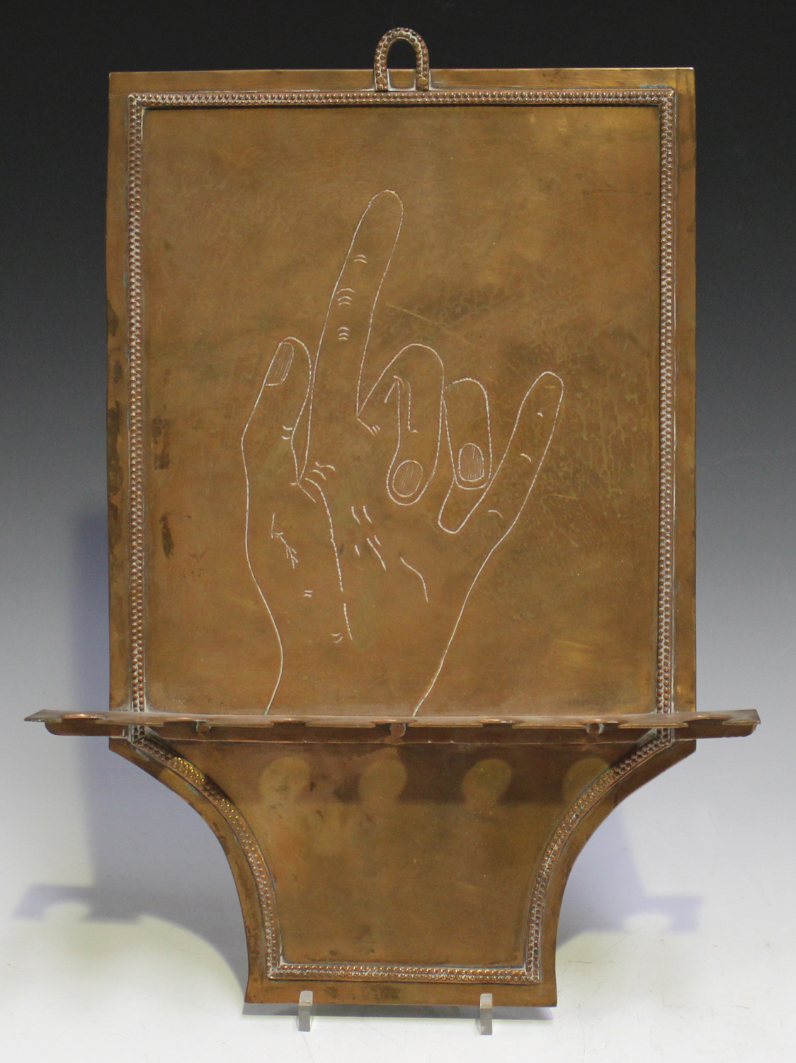 A 20th century Arts and Crafts style copper wall mounted pipe rack, the back panel punch-decorated with a hand symbol, height 41cm, width 30cm.