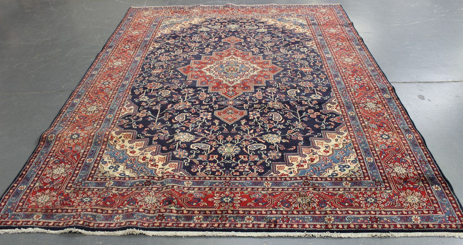A Tabriz carpet, Central Persia, late 20th century, the ink blue field with an angular medallion, profusely supported by flowering tendrils, within a complimentary red border, 334cm x 247cm.