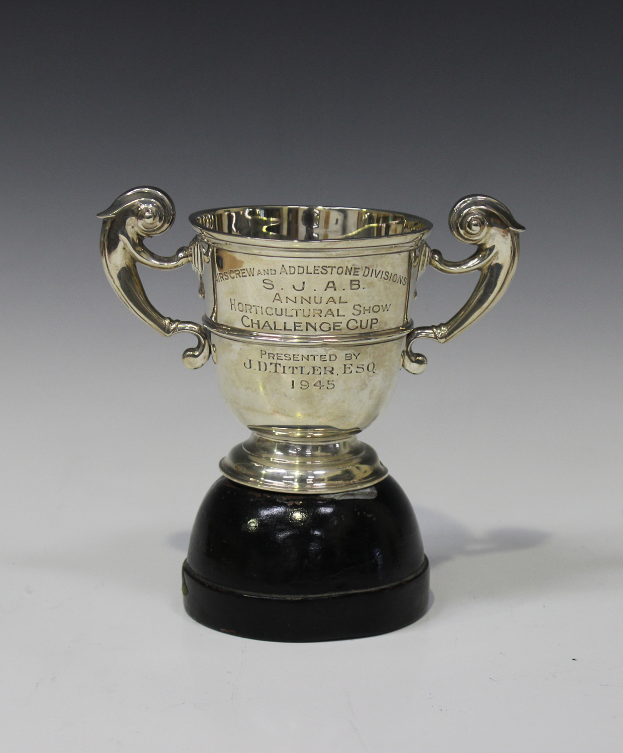 A George VI silver two-handled trophy cup of girdled 'U' form, flanked by a pair of flying scroll handles, on a circular foot, the front with presentation inscription, London 1938 by Carrington & Co Ltd, height 12cm, with an ebonized stand.