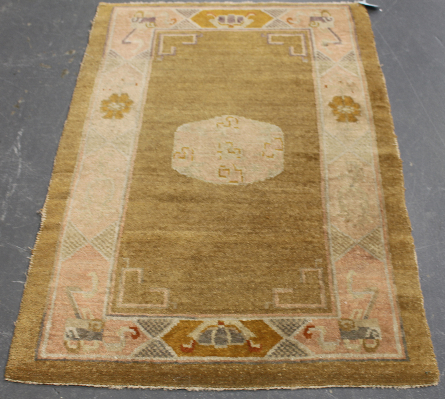 A Chinese rug, mid/late 20th century, the mustard yellow field with a central medallion, within a geometric border, 144cm x 93cm.