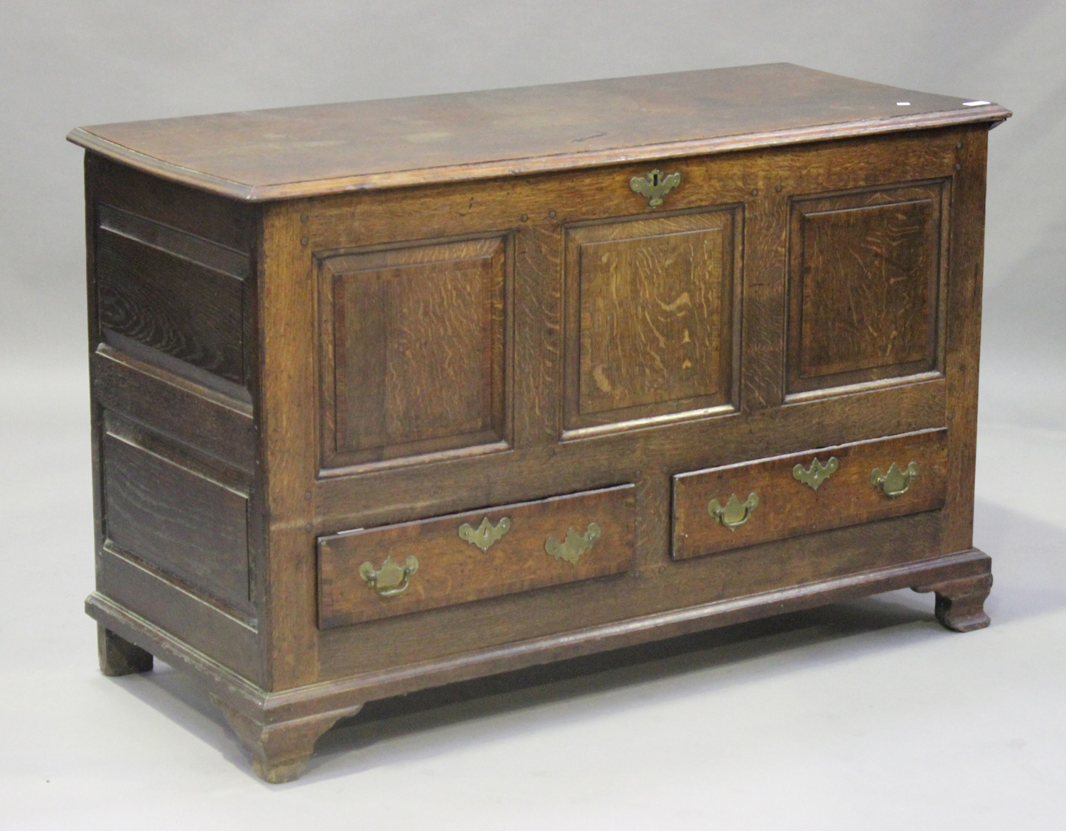 A George III oak mule chest, the hinged lid above a panelled and crossbanded front, fitted with two drawers, on bracket feet, height 83cm, width 130cm, depth 54cm.