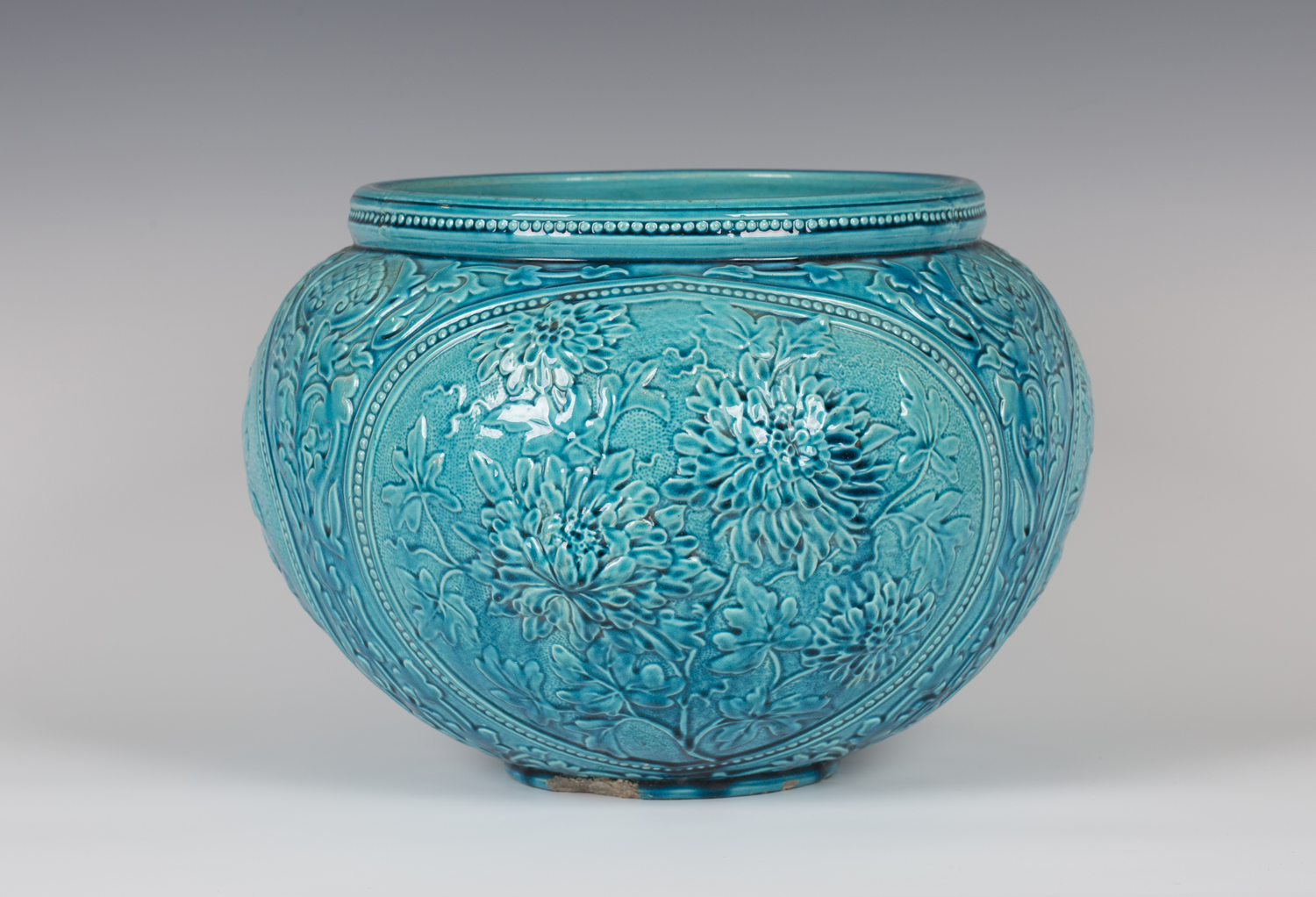 A Burmantofts Faience art pottery jardinière, 1890s, the turquoise glazed bulbous body relief moulded with three lobed panels of chrysanthemums against a stylized foliate ground, impressed marks to base, height 25cm (minor faults).