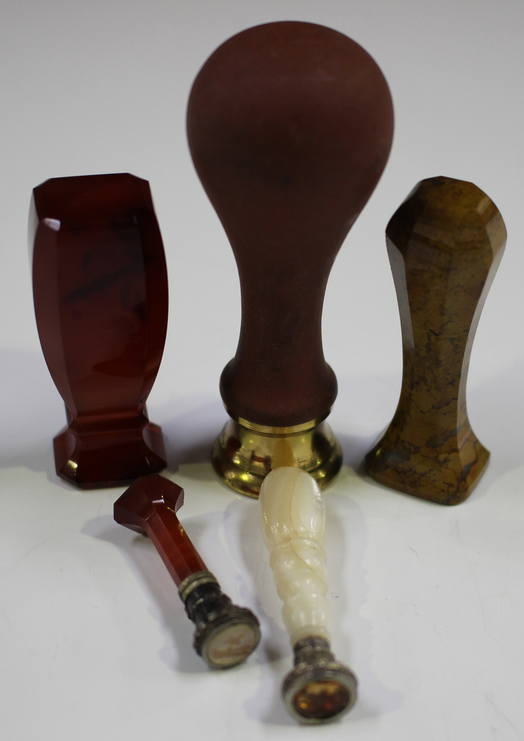 A 19th century hardstone seal of octagonal faceted form, the matrix engraved with a gentleman and inscribed 'I hope I don't Intrude', length 4.8cm, together with two agate seals, a mother-of-pearl handled seal and a terracotta seal with gilt brass terminal.