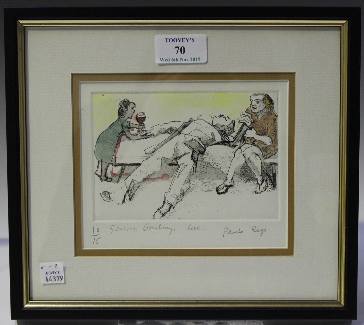 Paula Rego - 'Seasons Greetings', 21st century etching with hand-colouring, signed, inscribed and editioned 10/15 in pencil, 12.5cm x 15.5cm, within an ebonized and gilt frame.