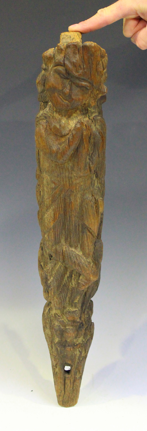 A carved architectural element, possibly 16th century, carved with a putto and scrolling leaves, length 56cm.