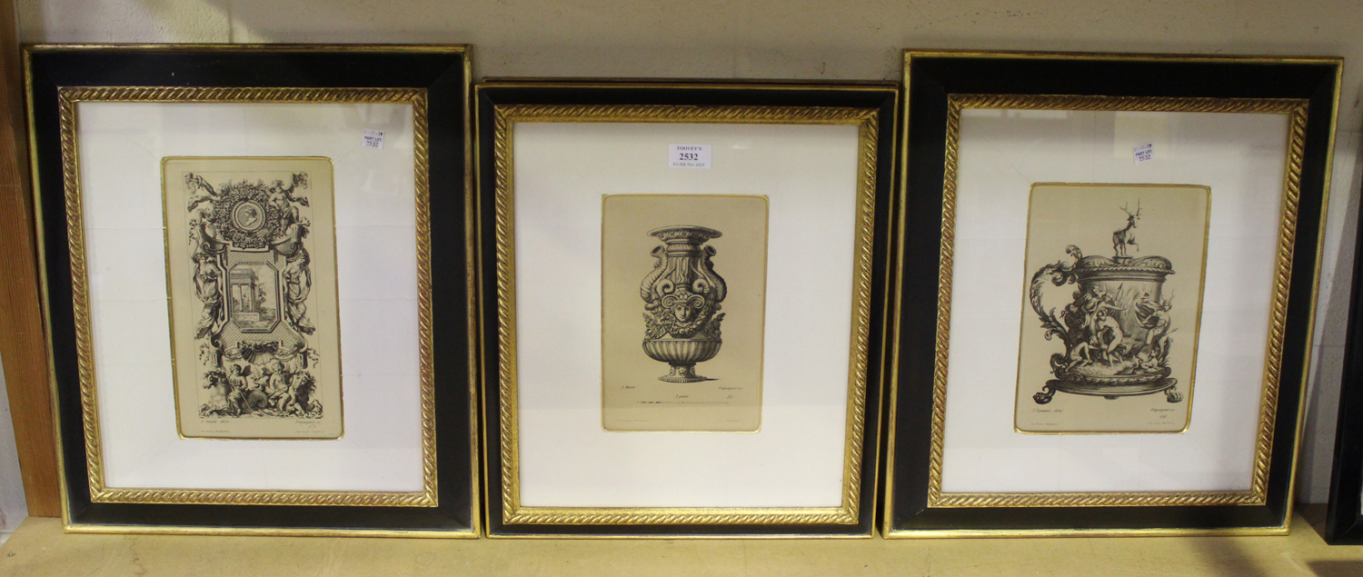 A group of four monochrome prints depicting Baroque ornamentation, all similarly mounted and framed, the frames with gilded ropetwist bands, 47cm x 40cm and 44cm x 38cm.