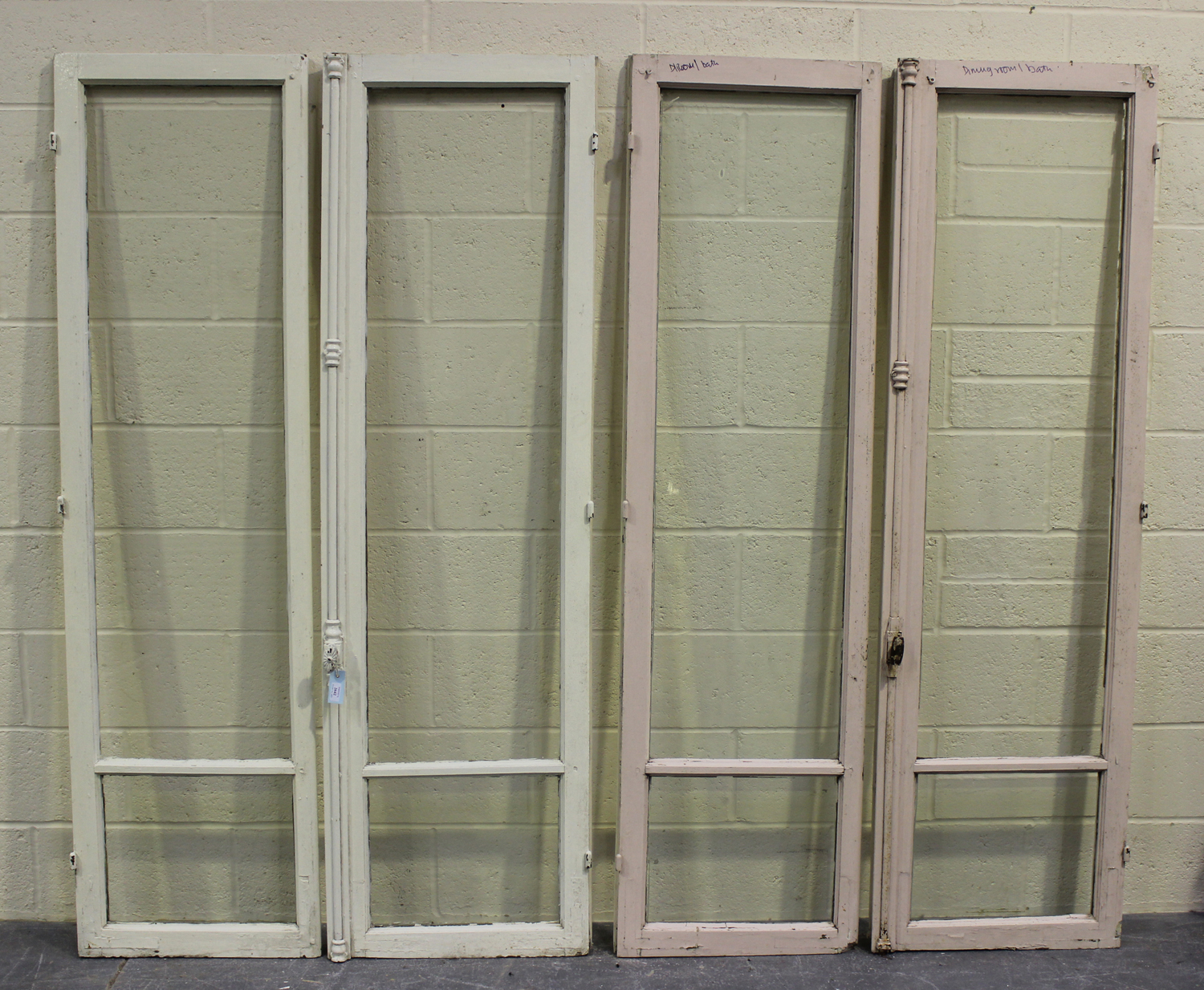 Two early 20th century matching pairs of white painted French doors, each pair with a locking handle and inset with glass, 193cm x 104cm.