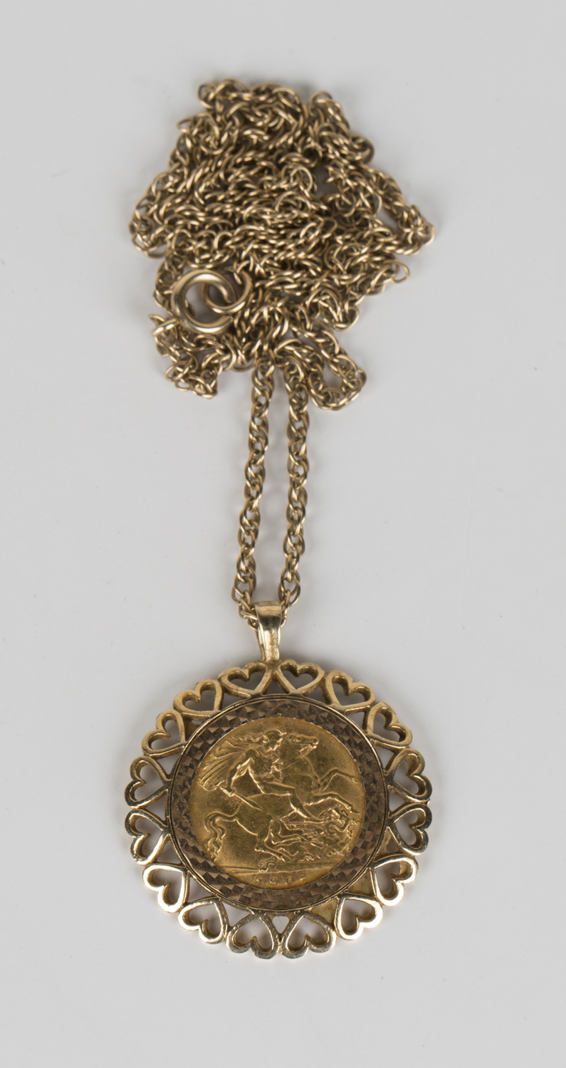 An Edward VII half-sovereign 1907 in a 9ct gold pendant mount with heart shaped motifs, with a gold multi-link neckchain, unmarked, length 54cm.