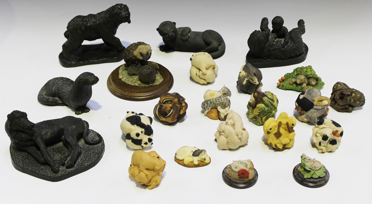 A collection of Border Fine Arts cast resin model groups of animals, mostly signed 'Boyt', together with other cast resin models of dogs and otters.