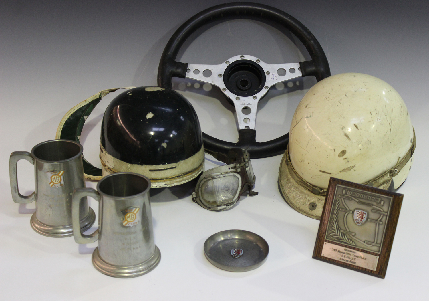 A group of motor racing automobilia relating to Ray. E. Dilley, including two 1967 'MG Car Club' trophy tankards, two helmets, a pair of goggles, a Moto-Lita steering wheel and related photographs.