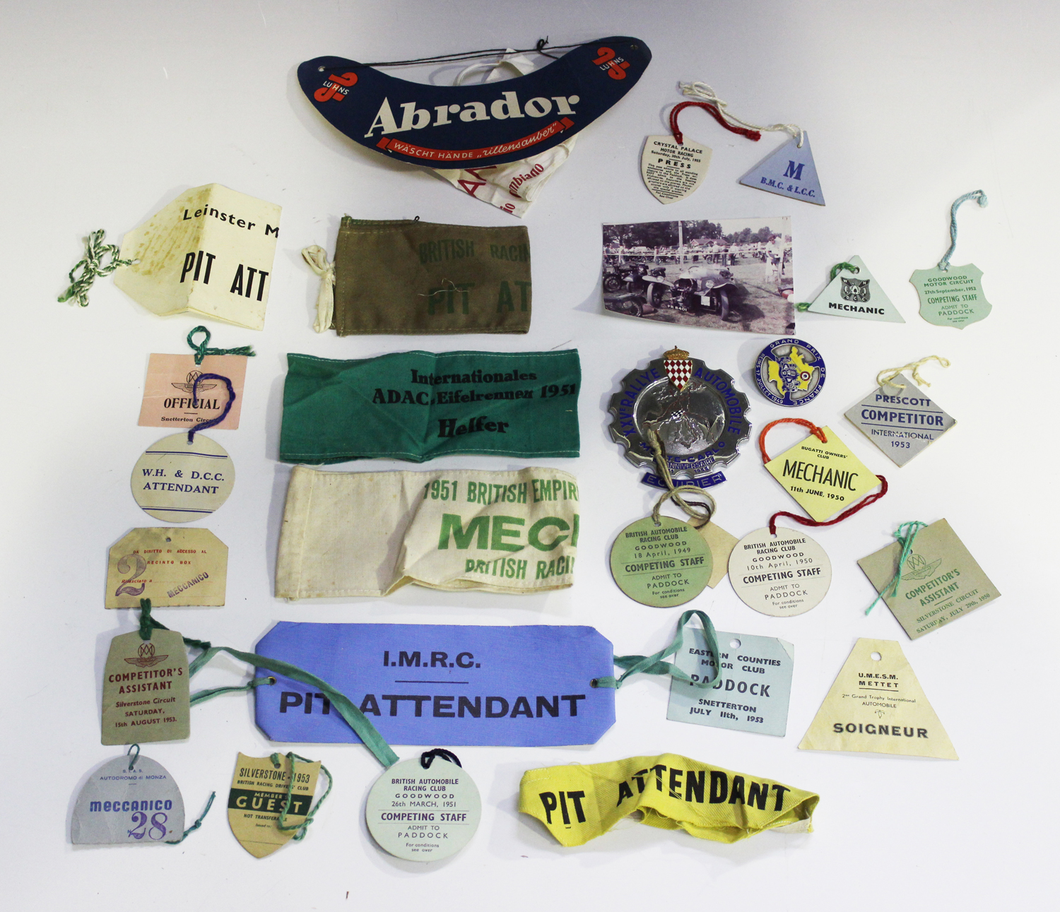 A selection of mainly mid-20th century motor racing paddock and pit pass cards and drivers' arm bands, together with a 1955 Monte-Carlo Rally badge.