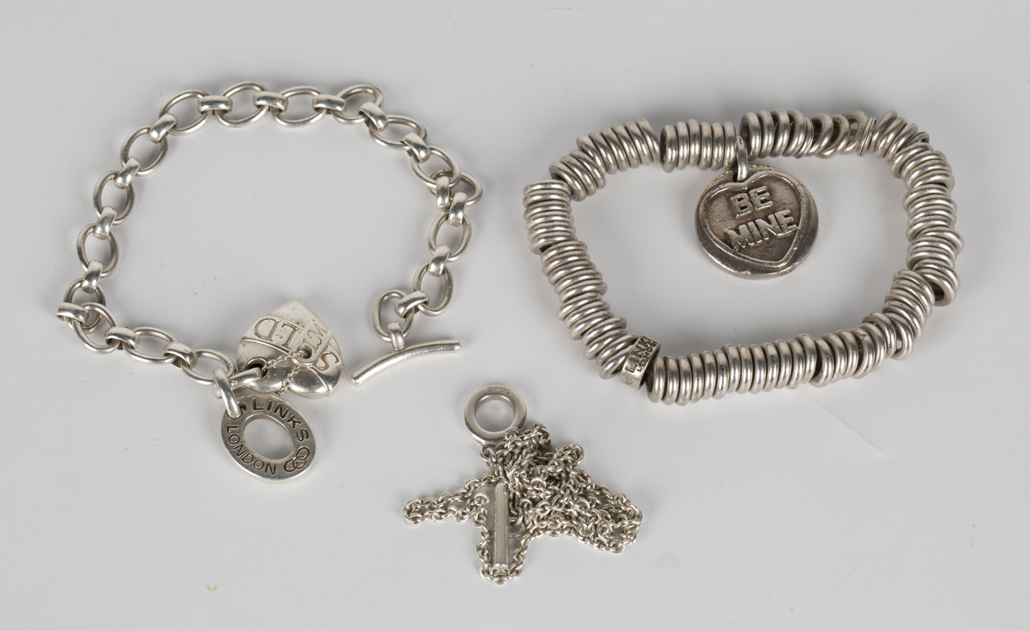 A group of Links of London silver jewellery, comprising an oval link bracelet with a heart shaped pendant, detailed 'Sold', a circular link bracelet with a pendant, detailed 'Be Mine', and a neckchain with a bar and circular clasp.