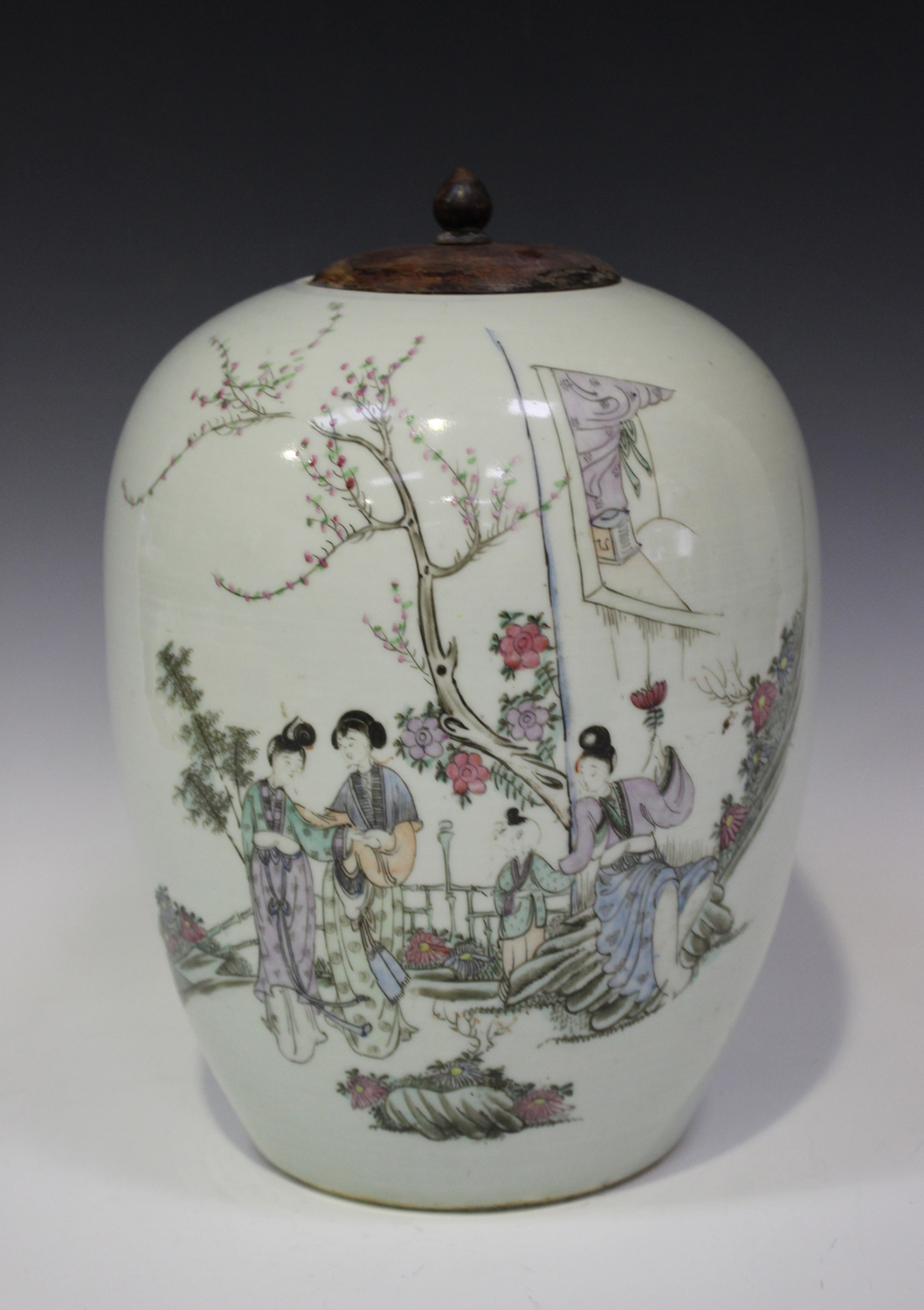 A Chinese famille rose porcelain ginger jar with wood cover, Republic period, the ovoid body painted with three maidens and a boy in a garden, opposing lines of black text, height 30cm.