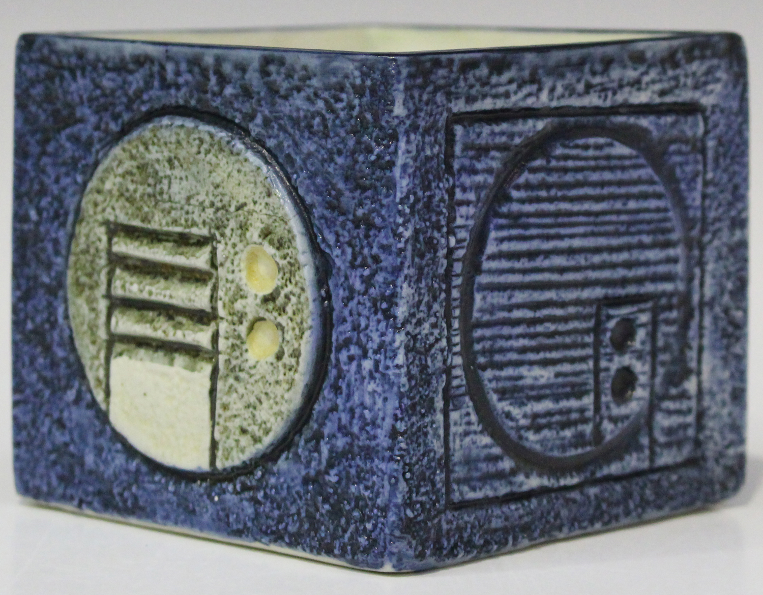 A small Troika cube vase, circa 1977-83, decorated by Jane Fitzgerald, monogrammed, with abstract geometric motifs against a textured blue ground, black painted marks to base, height 8.4cm.