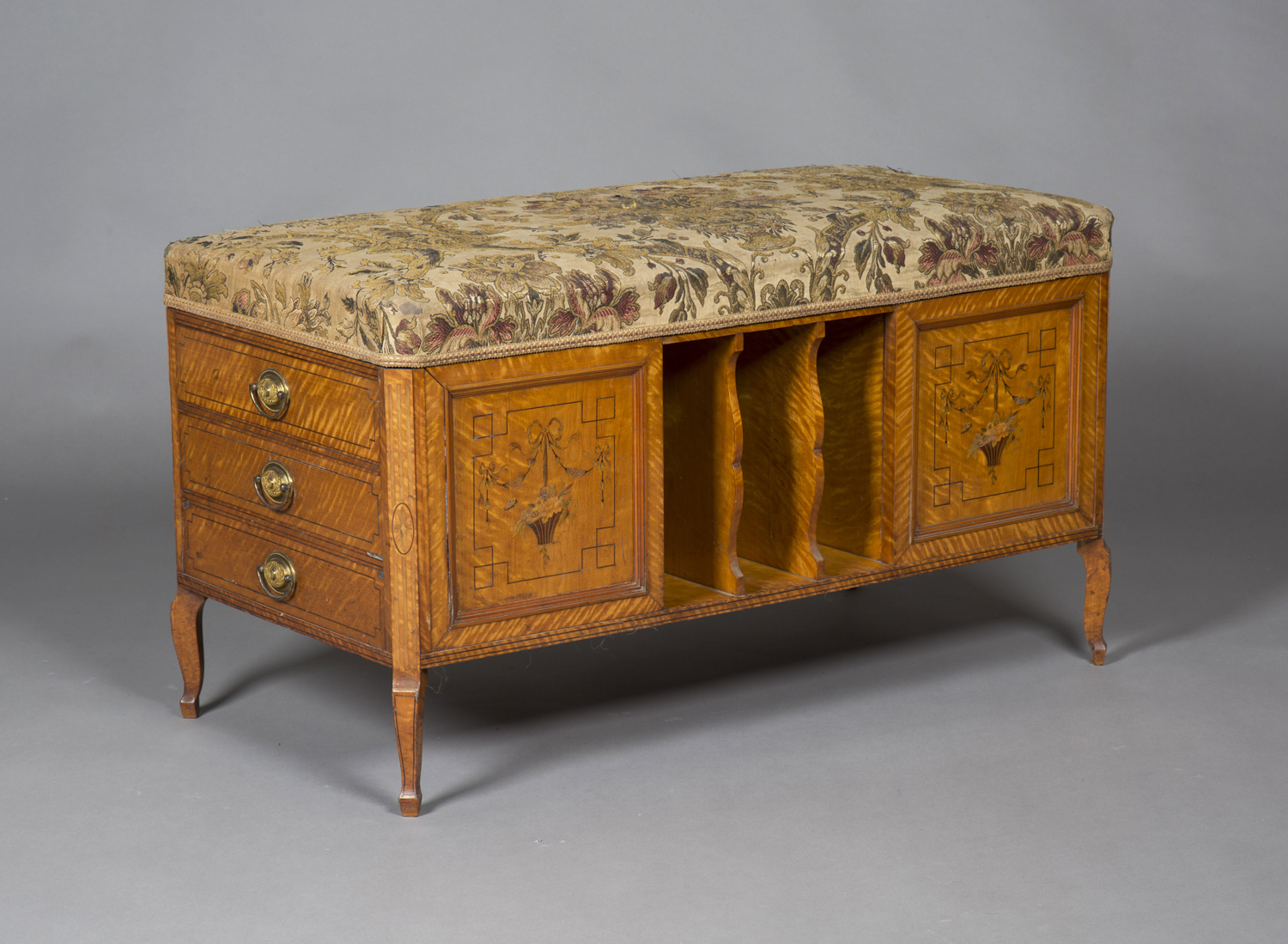 An Edwardian Neoclassical Revival satinwood duet music stool, in the manner of Edwards & Roberts, finely inlaid with ribbon and bellflower swags supporting flower-filled baskets, the upholstered seat above central music divides, each end fitted with three drawers, raised on shaped legs, height 54cm, width 96cm, depth 48cm.