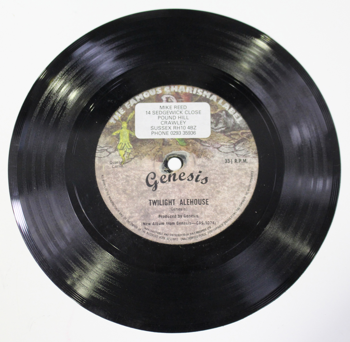A collection of 7-inch records, including a flexi disc of Twilight Alehouse by Genesis, many without original sleeves.