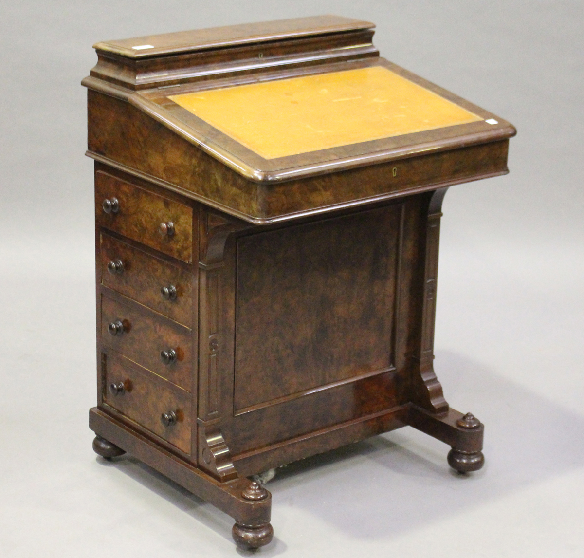 A mid-Victorian burr walnut Davenport by Thomas Turner of Manchester, the hinged writing surface above drawers, on bun feet, height 91cm, width 66cm, depth 57cm (alterations).