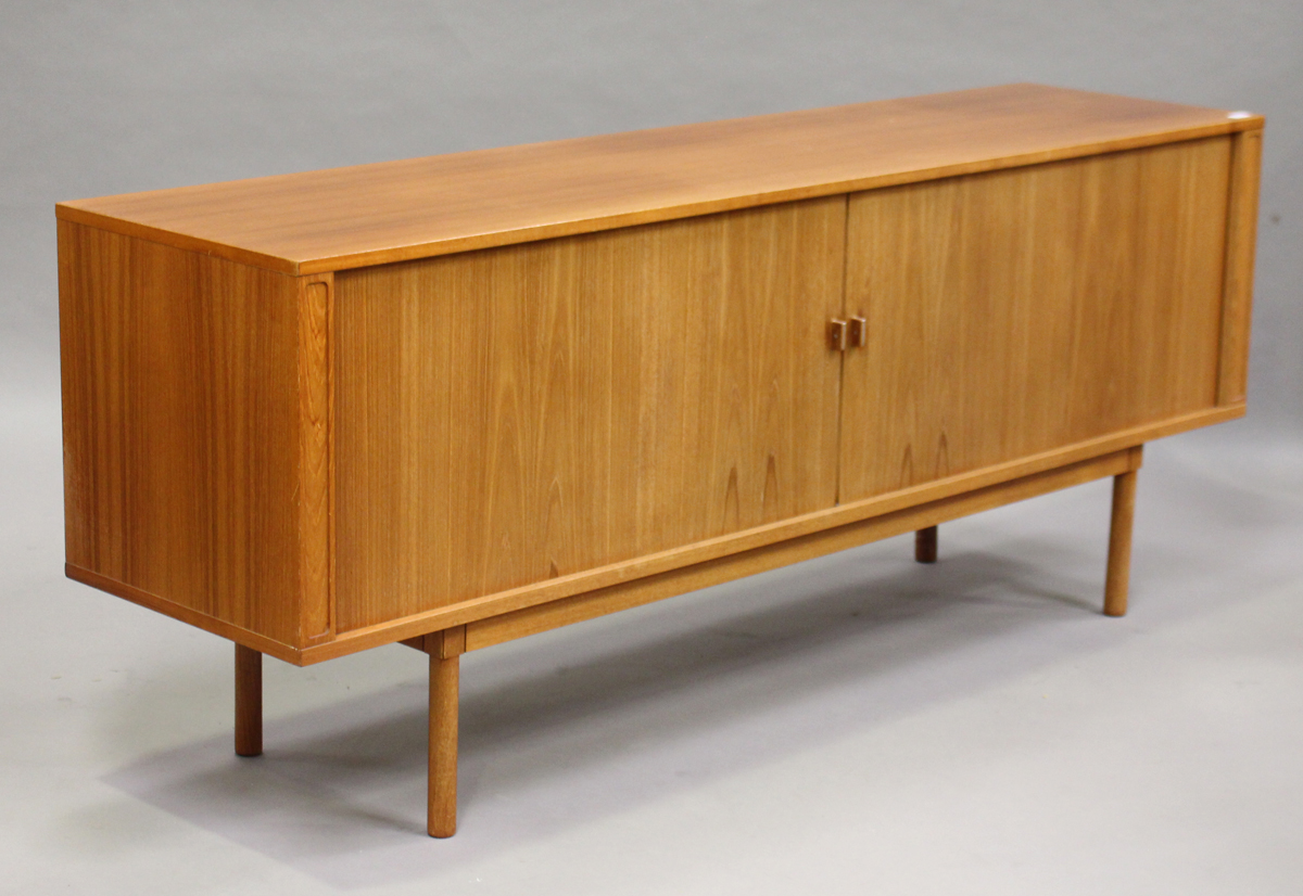 A mid-20th century Danish teak sideboard, designed by Jens Quistgaard for Peter Long, the two tambour shutter doors enclosing sliding trays and shelves, on turned legs, height 80.5cm, width 200cm, depth 50cm.
