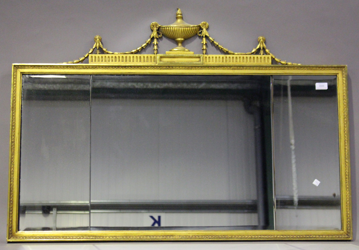A 20th century Neoclassical giltwood wall mirror with a sectional plate glass and flaming urn finial, 78cm x 112cm.