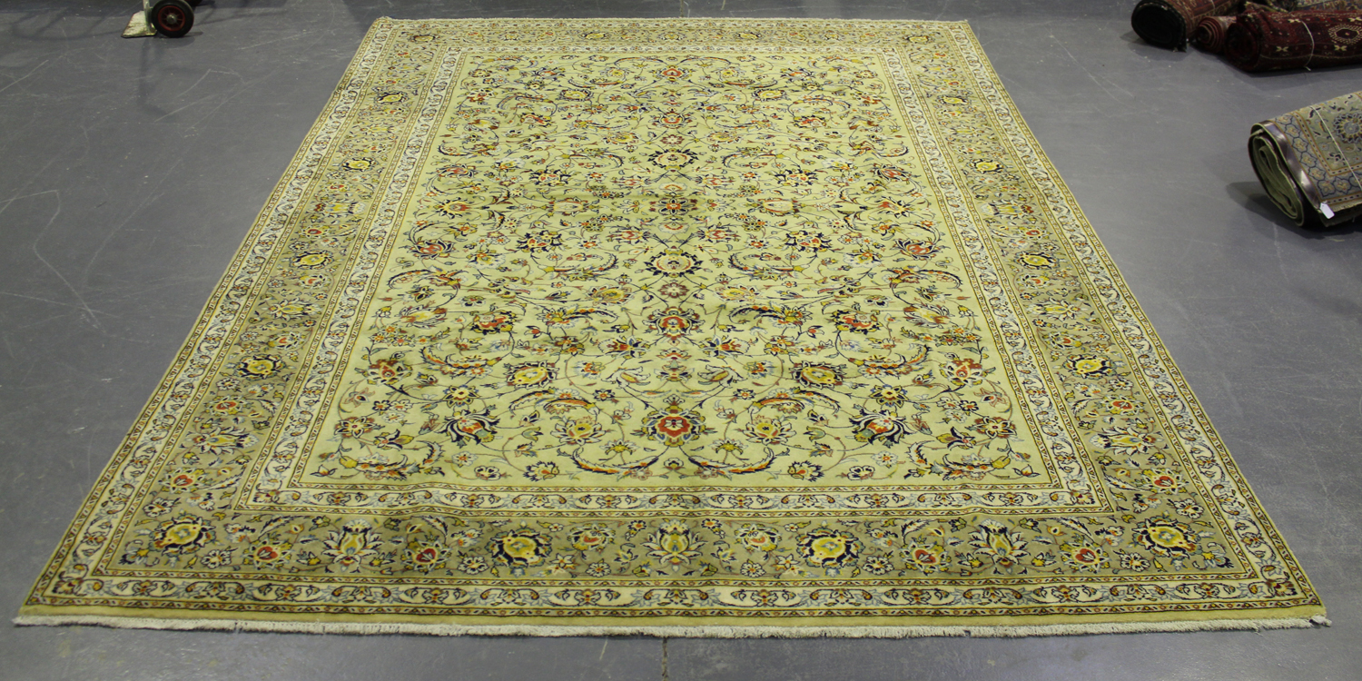 A Kashan carpet, Central Persia, late 20th century, the celadon field with overall scrolling tendrils issuing palmettes and flowerheads, within a complimentary border, 390cm x 281cm.