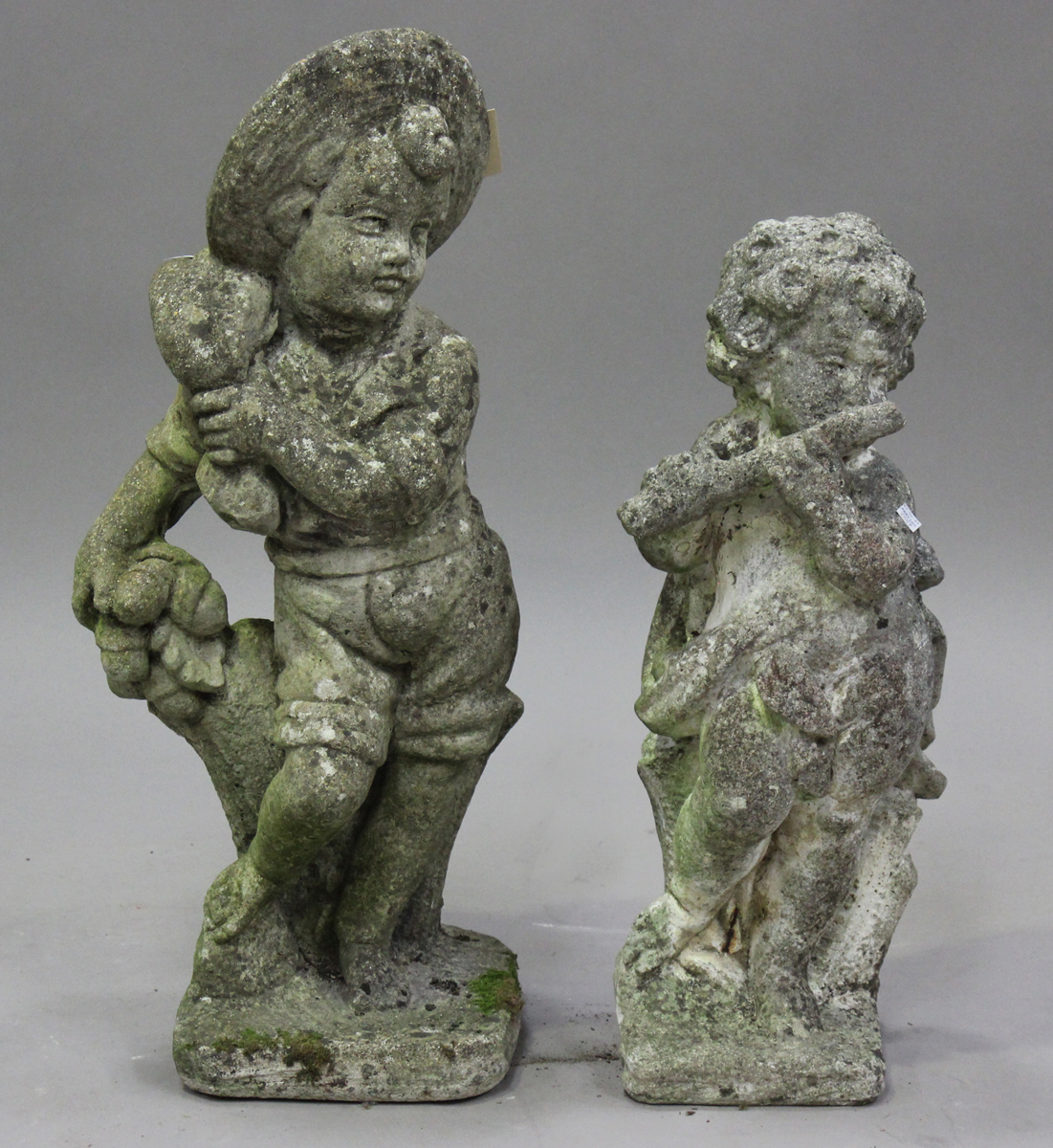 A late 20th century cast composition stone garden figure of a young boy, height 72cm, together with another figure of a putto, height 60cm.