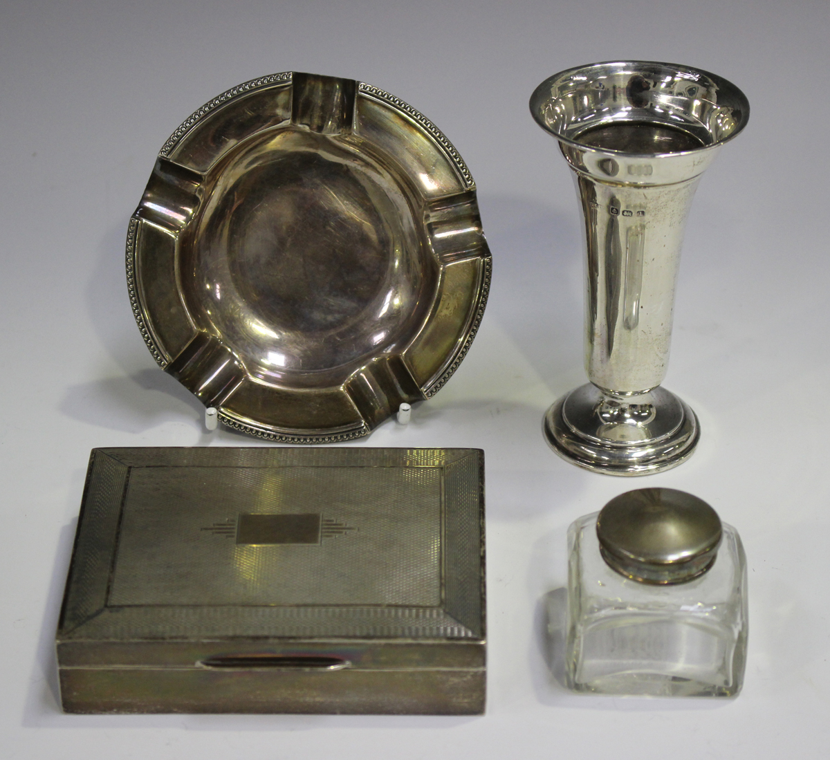 An Elizabeth II silver rectangular engine turned cigarette case, Birmingham 1951, length 11cm, a silver posy vase, Birmingham 1910, height 11cm, a silver circular ashtray, Birmingham 1952, diameter 11cm, and a square cut glass inkwell with silver cover, Birmingham 1911.