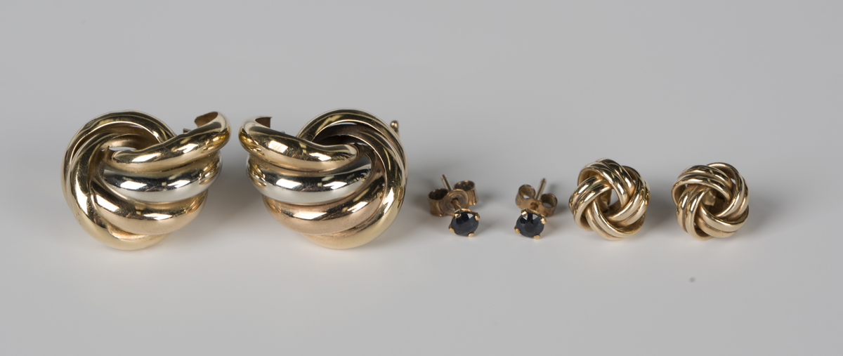 A pair of 9ct three colour gold earclips with post and sprung fittings, weight 6.3g, length 2.3cm, a pair of gold earstuds of knot design, with post and butterfly fittings, weight 1.3g, and a pair of gold and sapphire single stone earstuds, weight 0.5g.