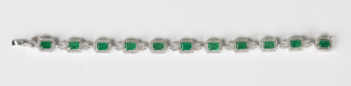 An 18ct white gold, emerald and diamond cluster bracelet, designed as a row of eleven cluster links, each claw set with the cut cornered step cut emerald within an open surround of circular cut diamonds, alternating with open oval diamond set links, weight 18.3g, total emerald weight approx 7.63ct, total diamond weight approx 1.81ct, length 17.2cm, with a case.