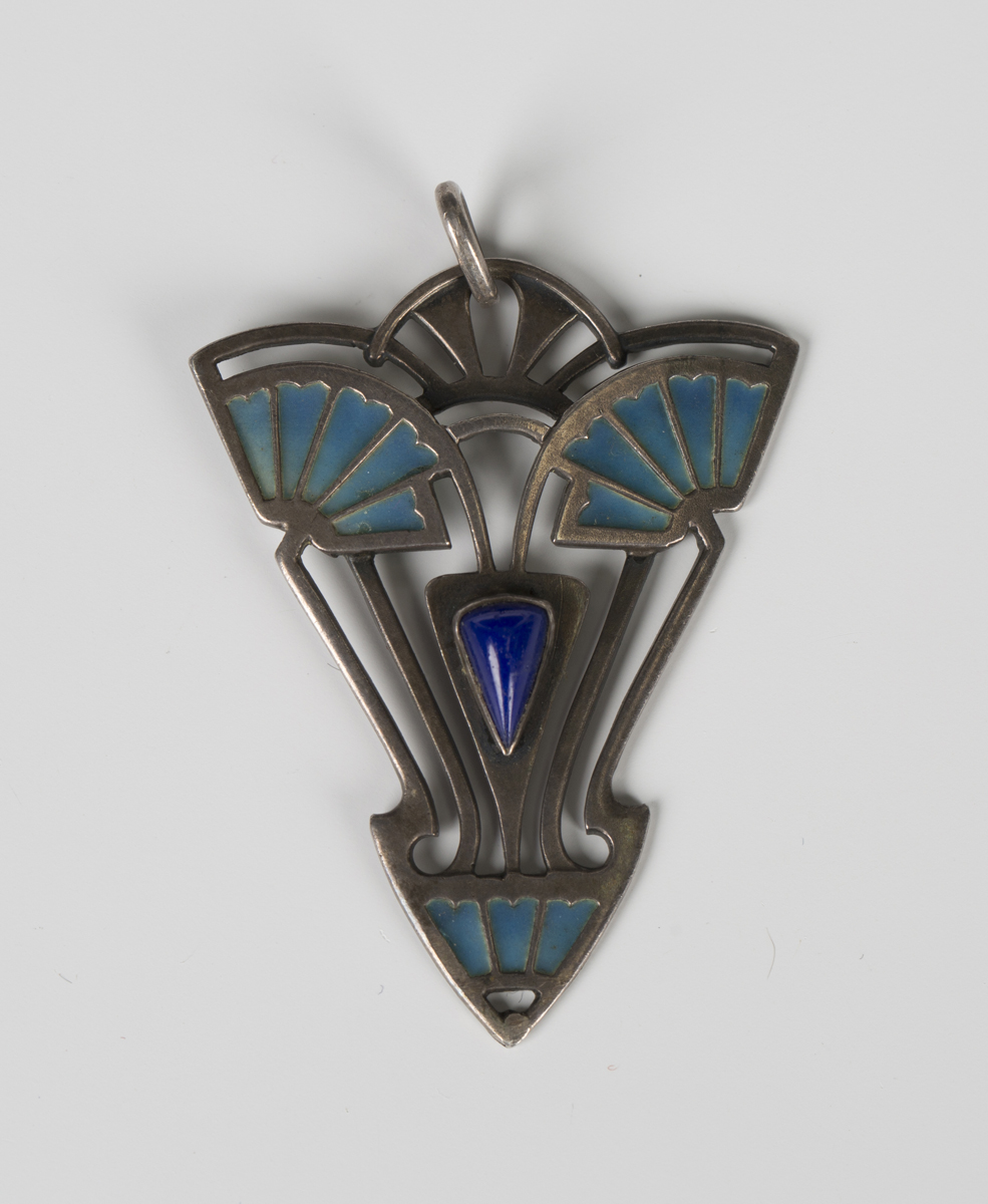 An Art Nouveau silver, plique-à-jour enamel and paste imitating lapis lazuli pendant with pierced and fanned decoration, detailed 'Sterling Silver Depose', weight 7.9g, length 5.5cm.