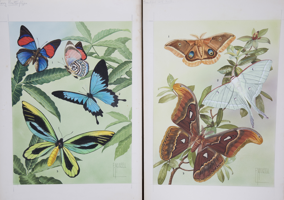 E. Mansell - 'Silk Moths', watercolour and gouache illustration, signed and titled, sheet size 38cm x 24.5cm, together with six further natural history watercolours by the same hand.