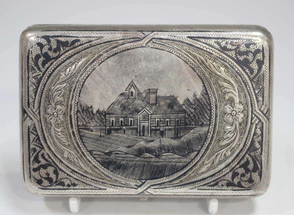 A Russian silver and niello cigarette case of rectangular form, 84 zolotnik, the hinged lid decorated with a building within a circular panel, bordered by engraved flowers and scrolls, the reverse decorated with a cross-hatched design, Moscow 1894 by Anatoly Artsibashov, weight 140.6g, length 10.2cm.