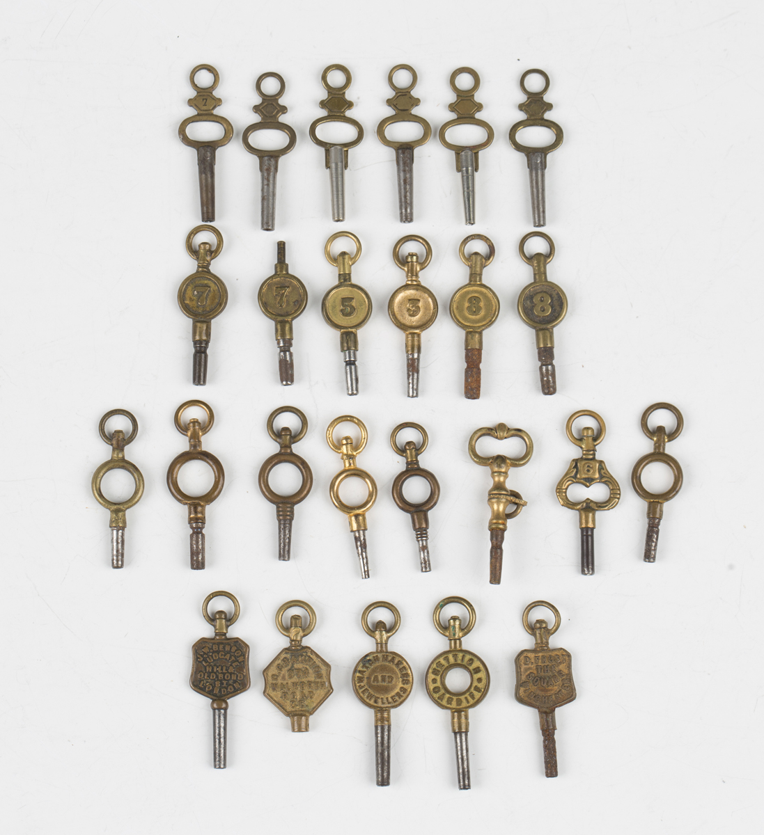 A collection of five advertising watch keys, including 'J.W. Benson... London', 'D. Frost... Winchester' and 'C. Champion... Walworth Rd S.E', together with twenty other various watch keys.