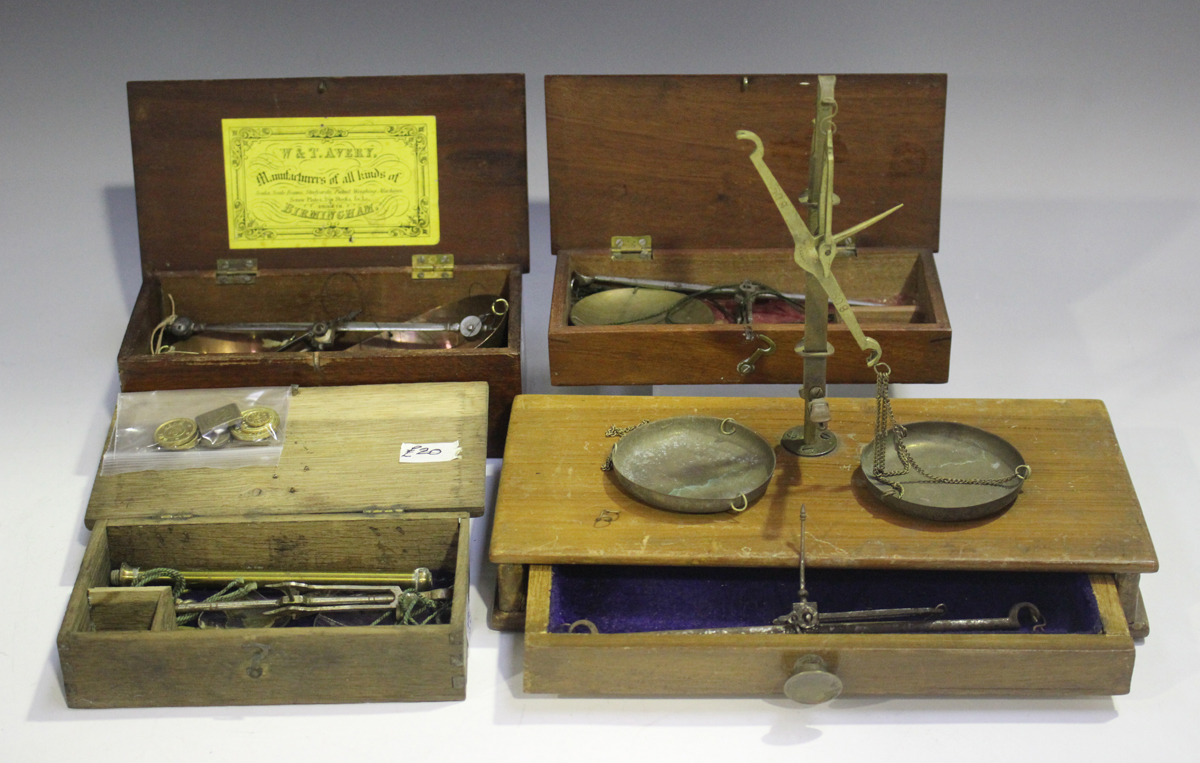 A set of 19th century steel balance scales with copper pans, length 16cm, and a small collection of various weights, within a mahogany box, the hinged lid interior applied with a printed paper label inscribed 'W&T Avery... Birmingham', length 18.1cm, together with three other sets of balance scales, boxed.