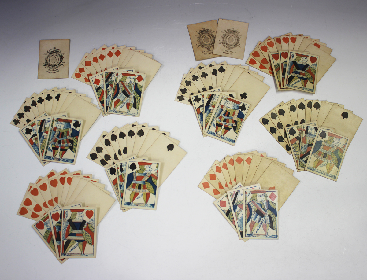 A George III deck of 52 playing cards, published by T. Wheeler, the garter ace detailed 'No. 66 Exportation', plain backs, 9cm x 6.5cm, together with a similar deck published by I. Hardy, two aces detailed 'No. 2' and 'No. 19' (lacking four of spades).