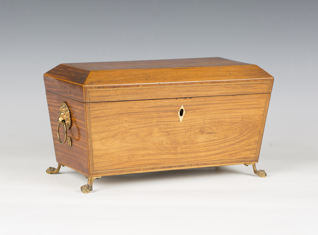 A Regency satinwood tea caddy with tulipwood crossbanding and boxwood stringing, raised on gilt metal claw and ball feet, width 32cm.