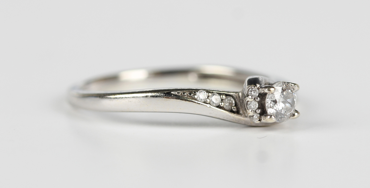 A 9ct white gold and diamond ring, claw set with the principal circular cut diamond between diamond set shoulders, weight 2.6g, ring size approx Q (one small diamond lacking).