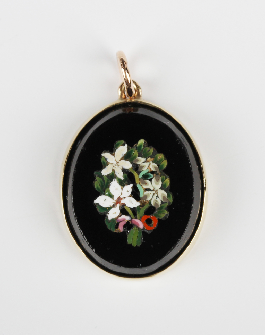 A Florentine gold mounted oval pietra dura pendant, designed as a posy of flowers bound with a pink ribbon, unmarked, weight 2.2g, length 2cm.
