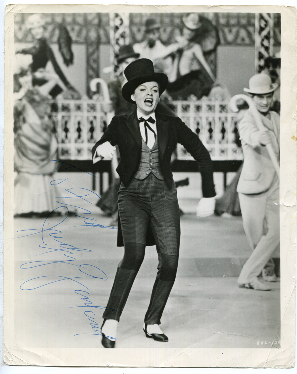 AUTOGRAPHS. A black and white photograph of Judy Garland signed in blue ink, 210mm x 255mm, together with a signed colour photograph of Michael Jackson and a mounted clipped signature of Barbra Streisand with accompanying black and white portrait photograph.